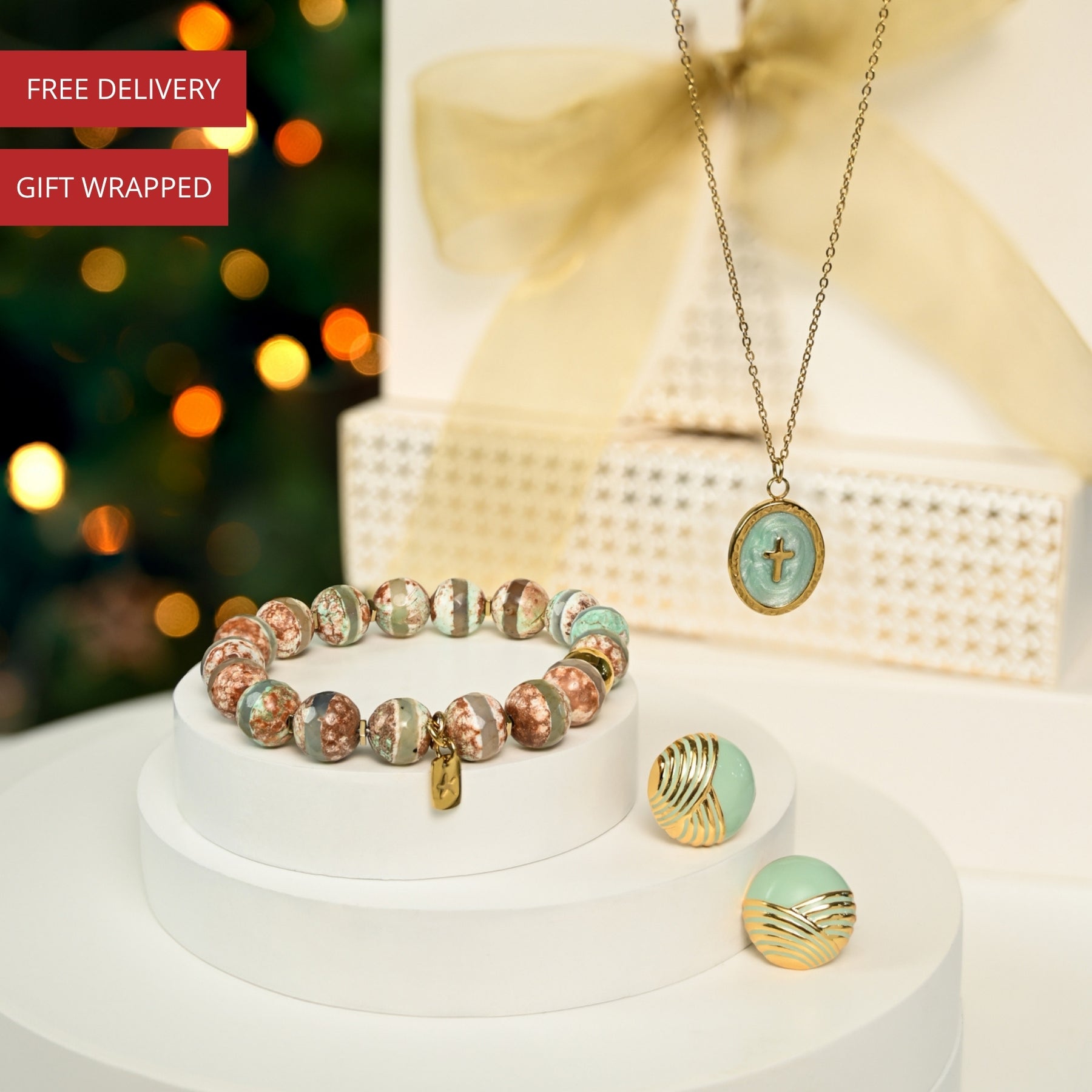 A gift that’s as stunning as it is meaningful! The Serenity & Shine Gift Set pairs the dreamy mint hues of the Shine Bright Cross Pendant, and Serenity Wave Earrings with the storytelling Maya Agate Bracelet for a look that’s both elegant and uplifting. Each piece tells a story: the hand-beaded Maya Bracelet celebrates courage and resilience with natural agate stones accented in 14K gold; the reversible Shine Bright Cross Pendant adds sparkle and faith to any outfit; and the Serenity Wave Earrings capture calm, peace, and renewal with flowing mint enamel waves. Perfect for happy-tear-inducing gifting! Your purchase supports survivors building brighter futures here at Starfish Project. Give a gift that shines, tells a story, and creates hope.