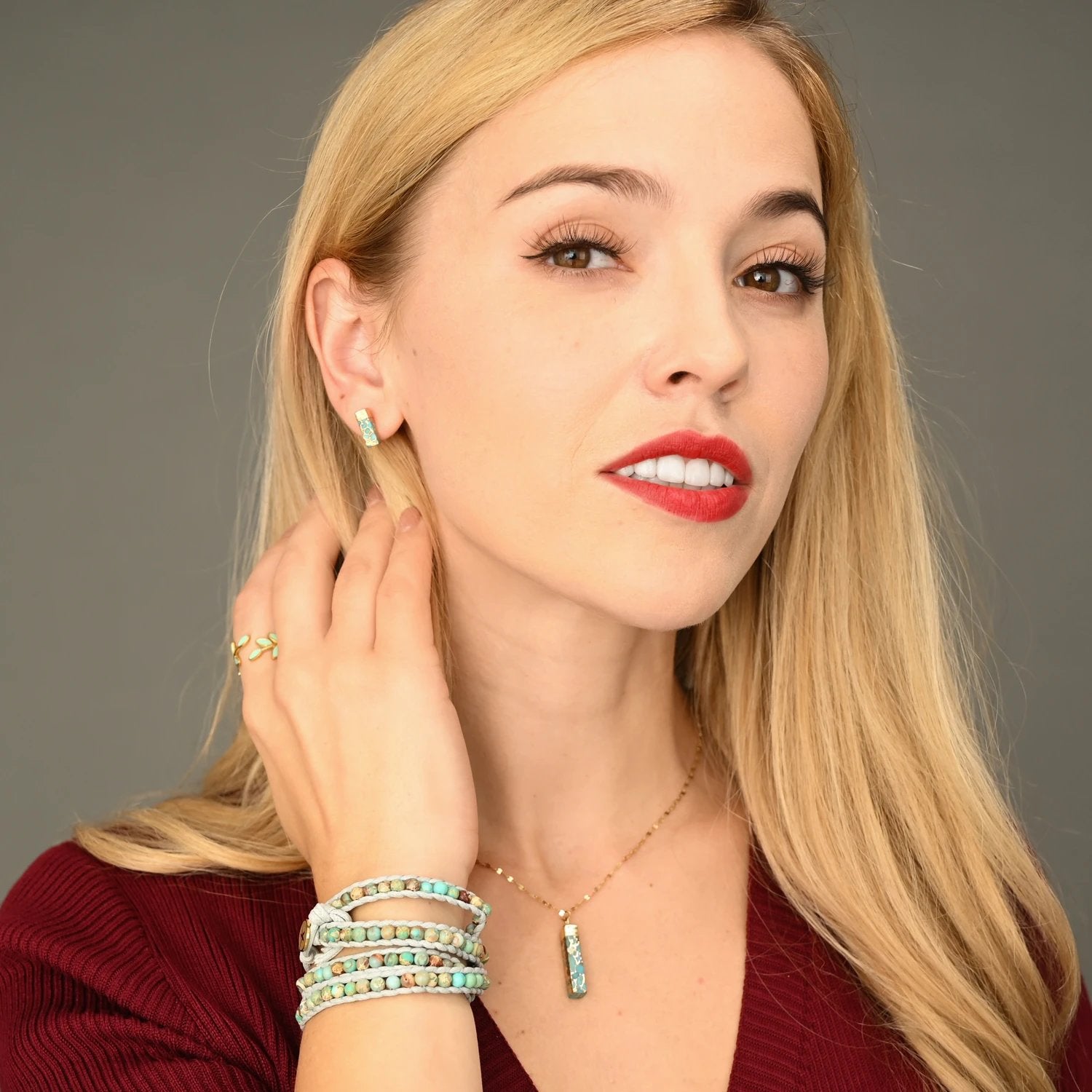 Our Brayden Turquoise Studs are a celebration of unique beauty. Each natural turquoise stone is dipped in sleek 14K plated gold on a classic post setting with flecks of gold woven within. As with the women of Starfish, each stone is uniquely beautiful! Wear your Brayden Studs paired with our bestselling Brayden Necklace and tell her story.