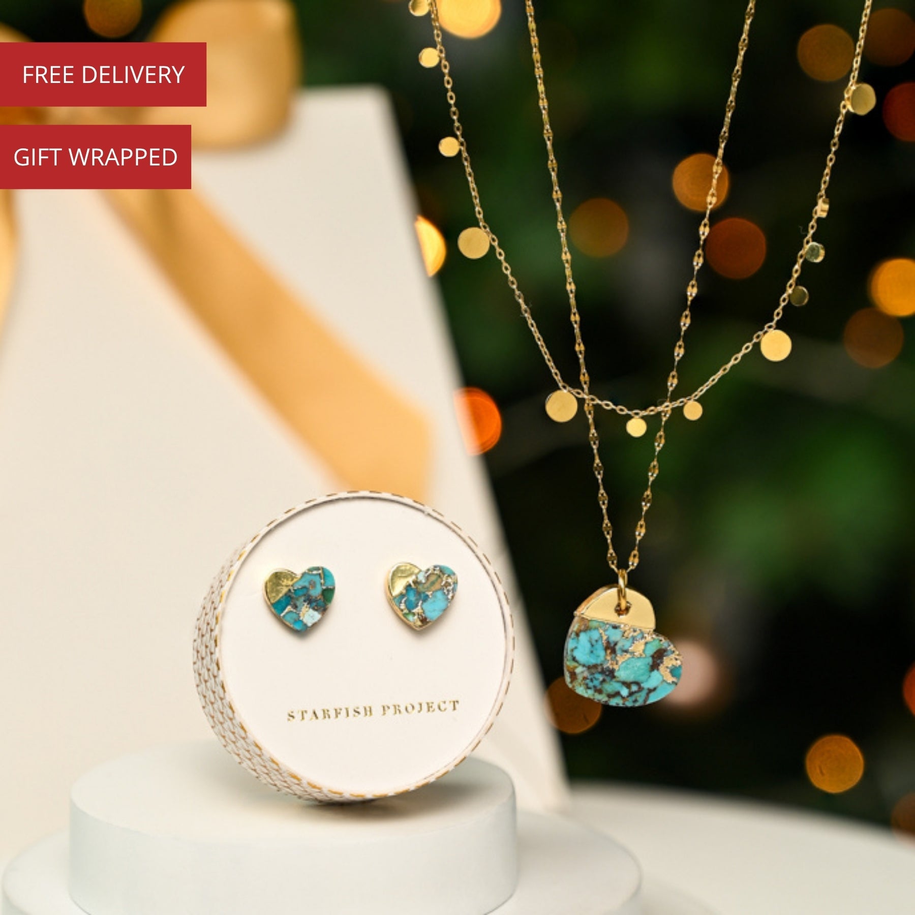 Shine boldly in the light of freedom with this radiant trio: the Hope Restored Necklace, Hope Restored Earrings, and the delicate, layer-ready Confetti Necklace. Each heart-shaped turquoise and 14K gold-plated piece is uniquely marbled—celebrating restoration, resilience, and the beauty that rises from healing. Paired with the adjustable Confetti Necklace, this set is as wearable as it is impactful, adding effortless shimmer to your everyday look. Every piece in this set carries a powerful message: you stand with women rebuilding their lives. You share her story. You wear hope. She walks in freedom. The Light of Freedom Set is perfect for layering, gifting, and starting meaningful conversations wherever you go.