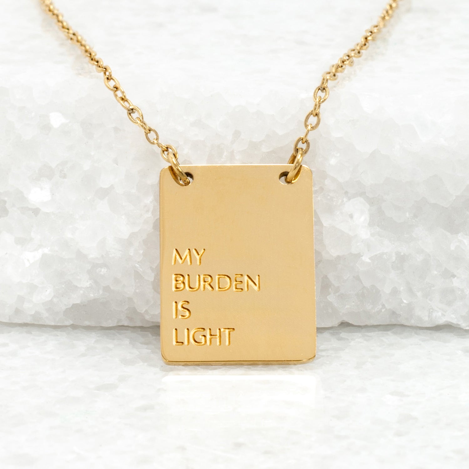Introducing the Lay it Down Necklace - a beautiful pendant engraved with "my yoke is easy, my burden is light” a comforting invitation to lay down our burdens. May this adjustable, reversible 14K gold plated necklace be a symbol of hope and help as you wear and gift this power piece. The Lay it Down Necklace is the perfect everyday encouragement to layer alongside your fair trade favorites! Thank you for restoring hope with us through your purchase of the Lay it Down Necklace!