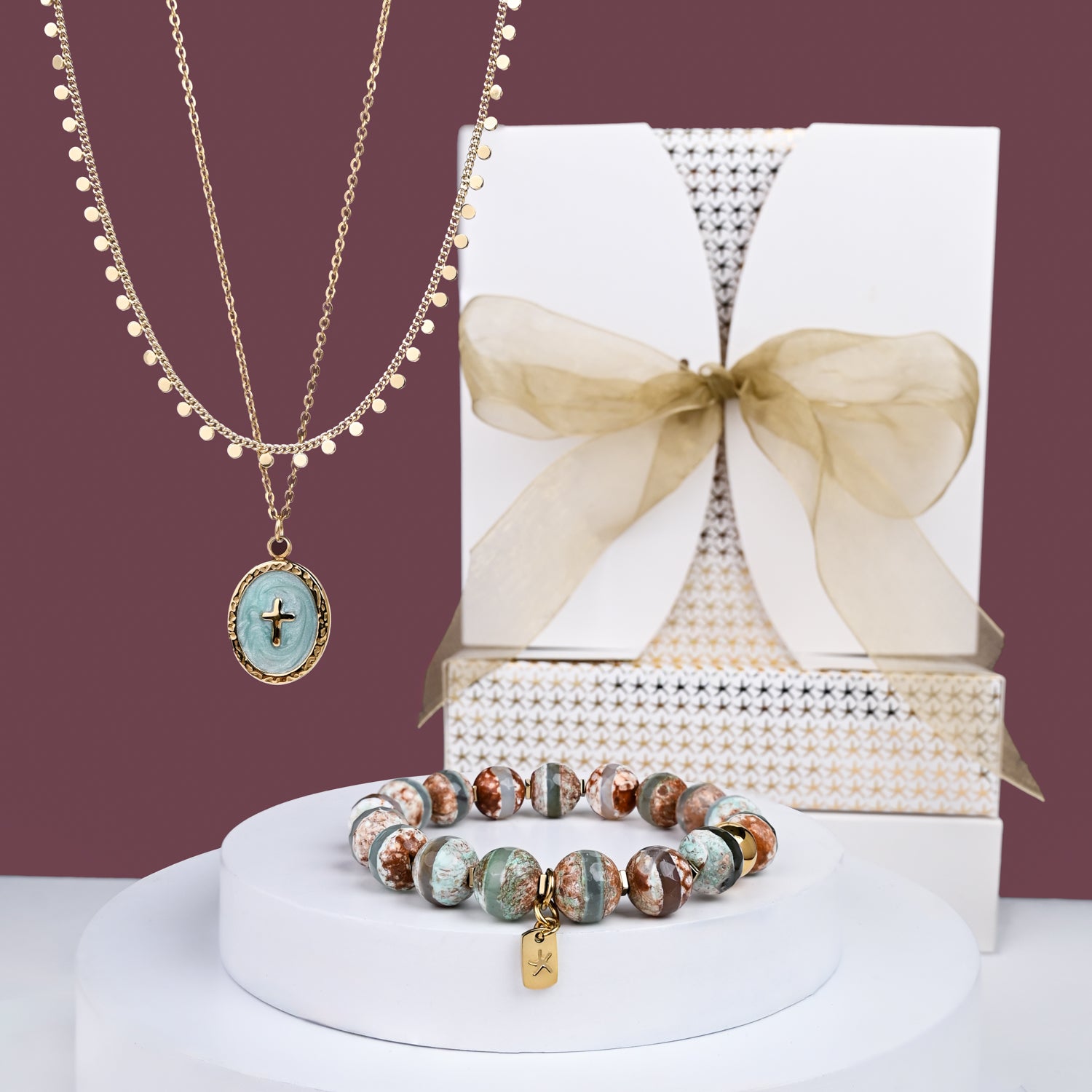 Celebrate hope, courage, and joy with this gorgeously paired set of meaningful jewellery. The Maya Agate Bracelet features hand-beaded natural agate stones in earthy tones with 14K gold accents — a symbol of strength and new beginnings. The Shine Bright Cross Pendant is reversible, with mint resin and sparkling zircon crosses on an adjustable 14K gold plated chain, perfect for layering wit the Joyful Radiance Necklace. She'll love to mix and match these meaningful pieces. Each helps women and girls create brighter futures at Starfish Project, making this set a truly thoughtful gift for someone special — or yourself.