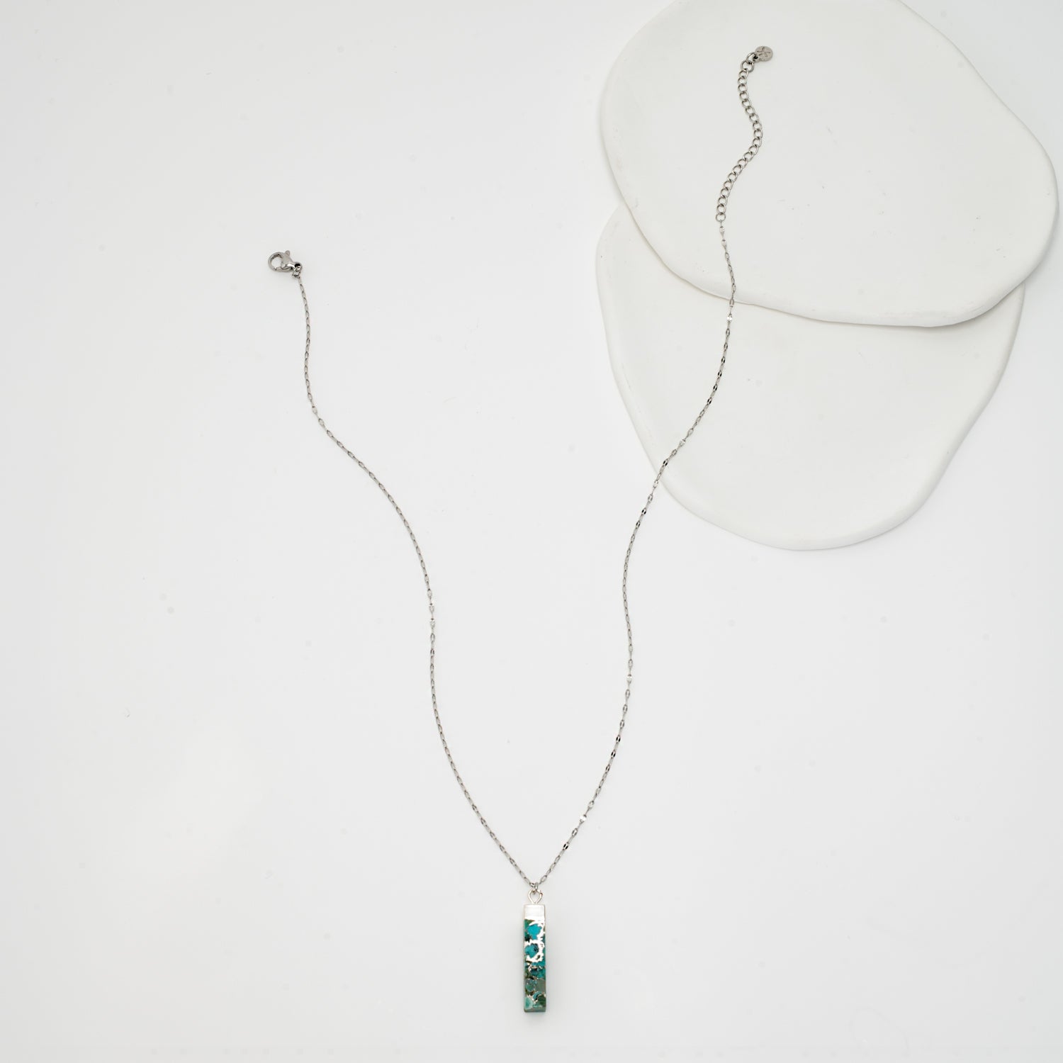 Materials: Natural turquoise and sterling silver pendant on a stainless steel chain Hypoallergenic; lead and cadmium free with nickel content less than 100 ppm