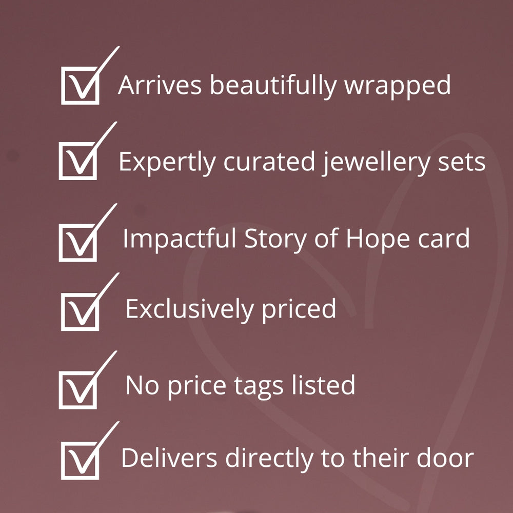 A woman wearing matching heart shaped jewellery set, gift set deals, sustainable fair trade jewellery, freedom business